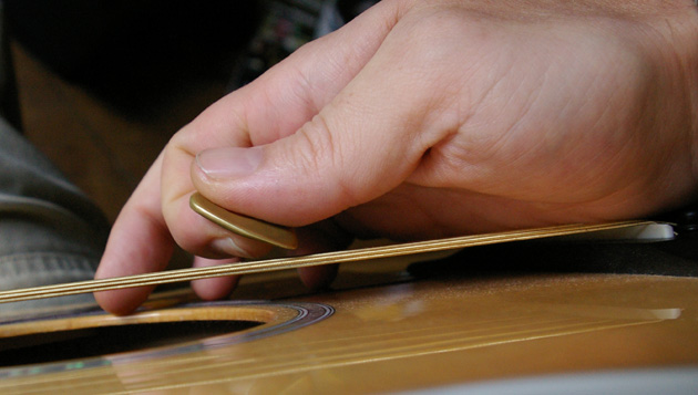 avec les cordes : l'ongle, la pulpe du doigt et le médiator.