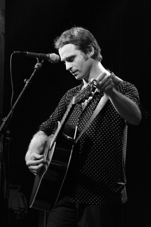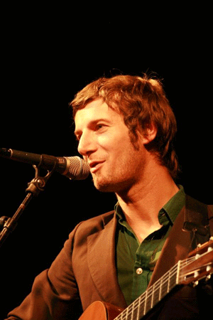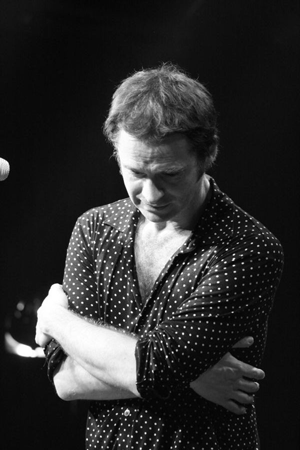 la main, et entame son set acoustique avec une nouvelle version