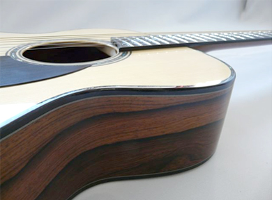 L'OM que nous présente ici François Sciortino est superbe aussi bien dans le son que dans la finition. J'aurais souhaité vous faire entendre le luthier lui-même pour cette présentation mais la timidté d'Emeric est aussi grande que la beauté de ses guitares.