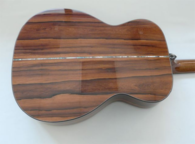 Format OM avec caisse en palissandre de Madagascar, table épicéa, manche acajou, touche, chevalet, pickguard en ébène. Tour de table et rosace en coeur d'abalone. Marqueterie : dragon et fleur de lotus.