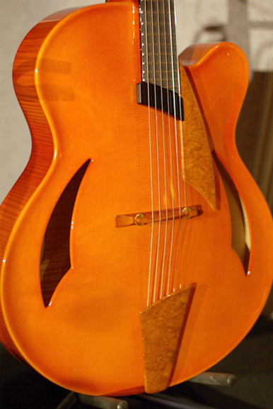 Après 20 ans d'ébénisterie et de menuiserie de construction, Peter Hopkins a fini par consacrer son talent à la lutherie, plus particulièrement à la guitare archtop. Sept ans plus tard, il sent qu'il est au meilleur de son art. Venez en voir la preuve, en découvrant deux de ses créations, la Contessa et la Monarch Regal.