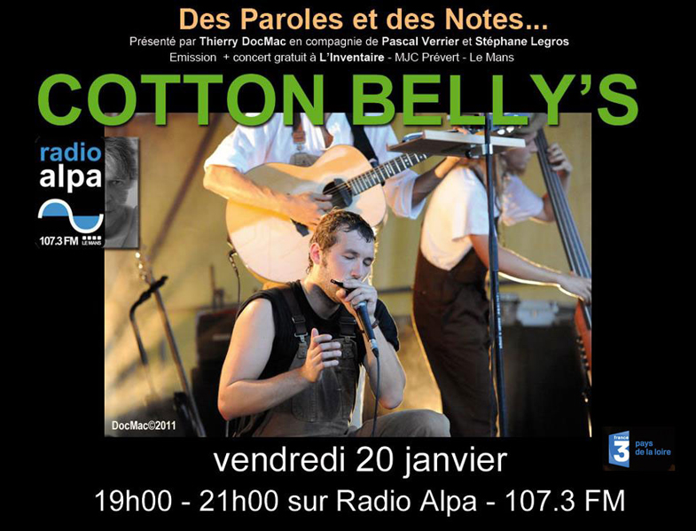 Les Cotton Belly’s seront les invités de l’émission « Des Paroles et des Notes… » sur Radio Alpa le 20 Janvier à partir de 19h00.