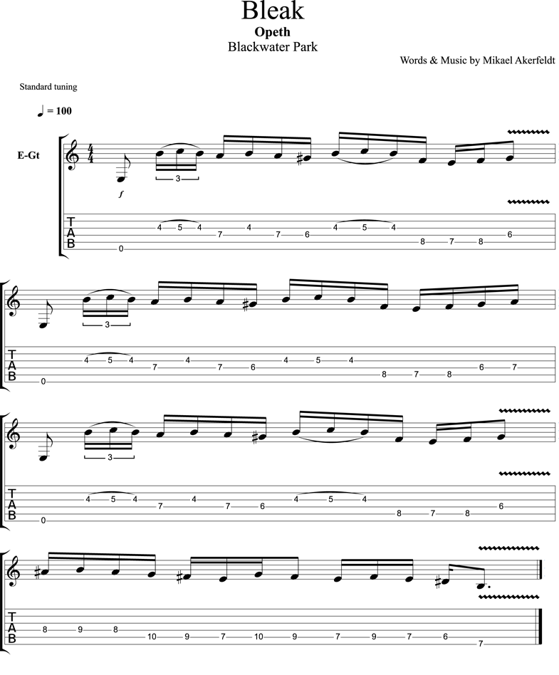 Bleak, tiré de l'album Blackwater Park paru en 2001, est intéressant pour nous autres apprentis guitaristes parce qu'il ne nous laisse que peu de temps pour respirer, démancher, tout en exigeant une grande propreté pour ne pas se transformer en grosse bouillie distordue.