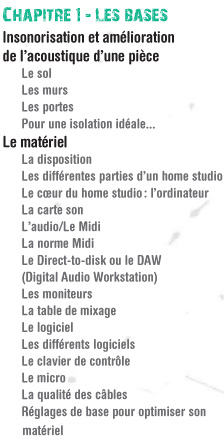 Le premier chapitre est consacré aux bases élémentaires qui sont ici plus qu'indispensables car monter son home studio nécessite de maîtriser un minimum de beaucoup, beaucoup de domaines car si cela peut paraître simple pour certains, il est un leurre de croire que l'on peut se constituer son propre home studio sans avoir acquis des bases fondamentales dans des secteurs aussi pointus que l'acoustique d'une pièce, de la sonorisation d'un instrument, de l'électronique de certains appareils et la manipulation de logiciels parfois complexes.