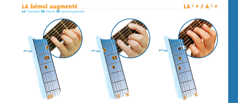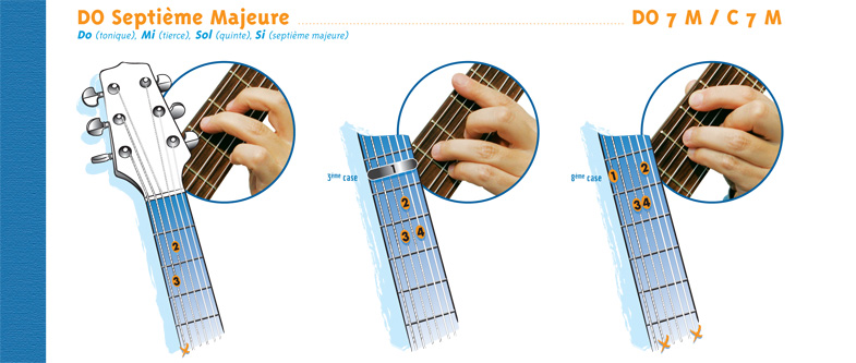 La position de l'accord est visualisée par des points sur le manche d'une guitare mais ce dessin est aussi accompagné d'une photo de la position de la main formant l'accord en question. Ceci a le mérite de vous montrer la difficulté ou pas de la position. Chose que l'on ne peut pas appréhender sur un dessin.