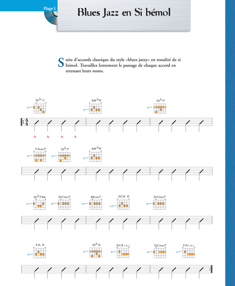 Un CD audio est livré avec ce dictionnaire vous proposant des exemples d'accompagnements dans des styles divers (blues, rock, jazz, samba etc..).