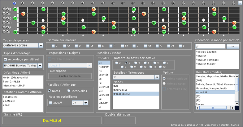 • Enfin choisir un mode dans Modes: la gamme s'affiche en Do mais vous pouvez transposer.