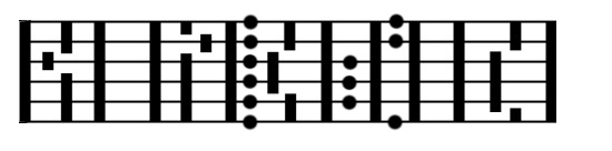 Intervalles entre les notes à partir de MI : 117¢, 76¢, 117¢, 76¢, 117¢, 117¢, 76¢, 117¢, 76¢, 117¢, 117¢, 76¢.