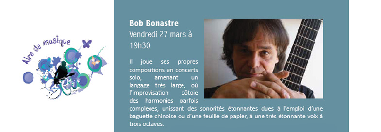 Bob Bonastre sera en concert solo à la Médiathèque de Cachan le vendredi 27 mars à 19h30.Entrée libre