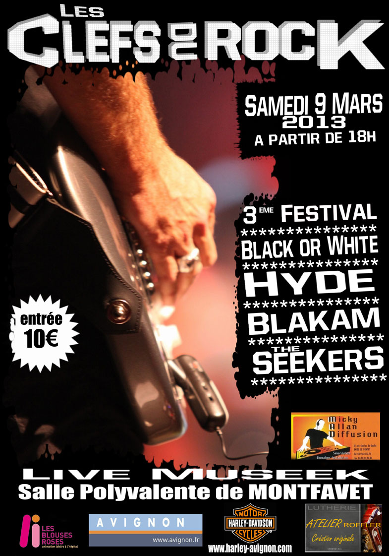 C'est pourquoi pour la troisième année consécutive, notre association avignonnaise LIVE MUSEEK, organise le SAMEDI 9 MARS 2013, le Festival LES CLEFS DU ROCK entièrement consacré au Rock des années 60 à nos jours. A partir de 18H jusqu'à minuit. Quatre groupes de reprises Rock: Les Black or white; Hyde; Blackam; The Seekers vont faire vibrer la scène de la salle polyvalente de Montfavet.