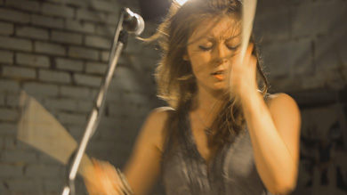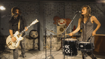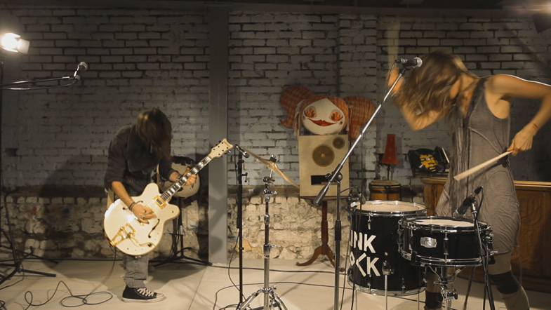 Aurélien fait lanciner ses cordes avant de les faire saigner de saturation, pendant que Jennie, half-drummeuse, se tient debout pour frapper au mieux du plus fort.