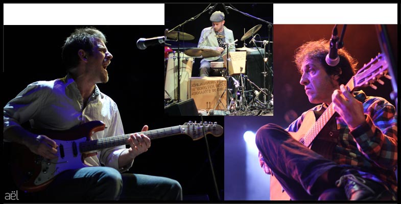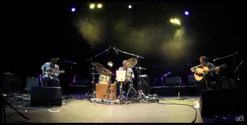 Ce trio se compose (par ordre alphabétique) de Franck ARMAND (percussions), Brice DELAGE (guitare électrique) et Yan VAGH (guitare acoustique). Cependant, chacun amène énormément et nous fûmes souvent surpris par le côté « orchestral » de la musique produite. Ces trois extra-terrestres nous ont mijoté un cocktail explosif et réjouissant situé quelque part entre les folies du « jazz-rock » des années 70/80 et les libres expérimentations de la musique savante du vingtième siècle. Les concerts à Issoudun étant plutôt consacrés à de la musique tonale ou du moins modale, on aurait pu craindre que le public ne trouve tout ça un peu trop débridé et/ou cérébral ... mais au contraire ! La salle a rapidement été conquise par ce trio de choc. Les pièces classiques connues (voire très célèbres) qu’ils triturent donnent lieu à de multiples variations. Le résultat ne ressemble à rien de connu tout en conservant des éléments familiers : traces harmoniques, motifs rythmiques, couleurs ou éléments mélodiques.