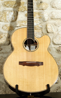 Alain doit être le seul luthier en guitares folk à refuser de réaliser des Dreadnought. Ce point m'avait marqué la première fois que je l'avais contacté en 1997 car c'est cette forme que je souhaitais. N'étant pas à l'époque aussi connaisseur en guitare, j'ai fermé les yeux et j'ai fait mon choix parmi les formes qu'il me proposait. Je ne l'ai pas regretté !