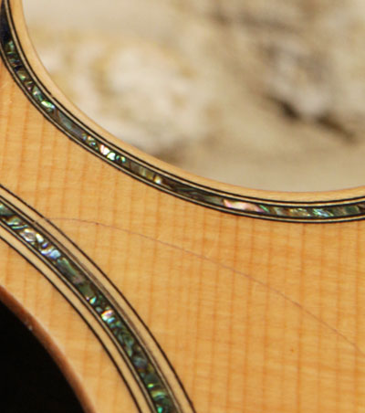 La rosace est un assemblage de purfling et de nacre d'Abalone, tout comme le tour de table.