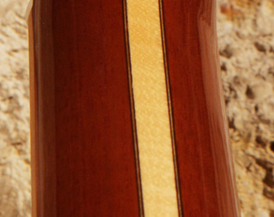 Depuis plusieurs années Alain propose des manches en trois parties avec un acajou sud-américain et une âme centrale en érable ondé. Ceci a pour conséquence d'avoir un manche plus dense, avec plus de tenue de note et de sustain.