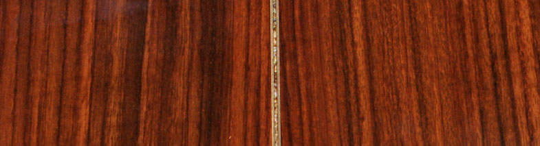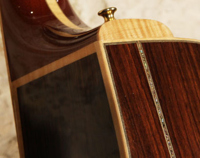 Dos, éclisses sont réalisés dans un palissandre indien de toute beauté mis en valeur sur le dos par un filet en nacre et sur le tour de caisse par un filet en érable ondé qui est sans comparaison bien plus beau que ce vulgaire plastique que l'on retrouve sur certaines guitares folk.