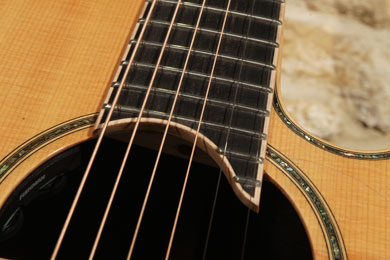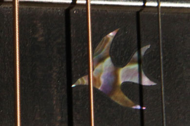 La touche en ébène a pour repères des petits oiseaux en nacre qu'Alain propose systématiquement à ses clients. Discrets et de très bon goût, ils sont nettement plus gracieux que la plupart des repères de touche.