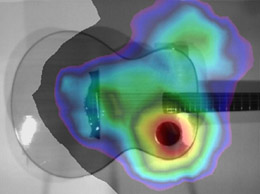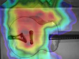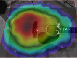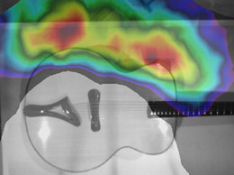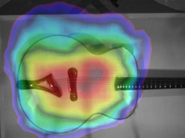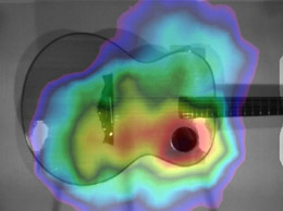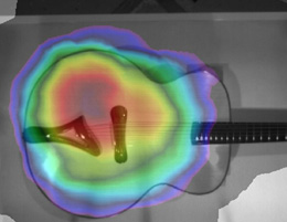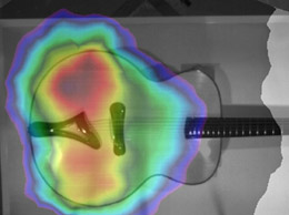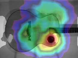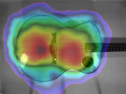 Comme pour les guitares archtop, les ouvertures se comportent comme des sources omnidirectionnelles à basses fréquences. Les prochaines figures montrent les images pour l’intensité positive et négative à 125 Hz: