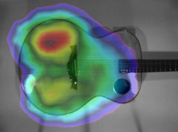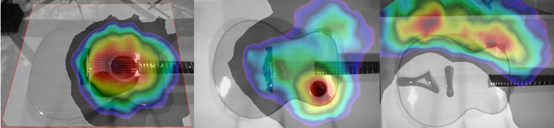 Comme pour les guitares archtop, on peut conclure que le son provient des ouvertures à basses fréquences. Lorsque la fréquence augmente, le son est progressivement émis par la table d’harmonie. À hautes fréquences, la contribution des ouvertures sur le son émis est pratiquement nulle. La transition survient à plus basse fréquence pour les guitares à conception moderne.