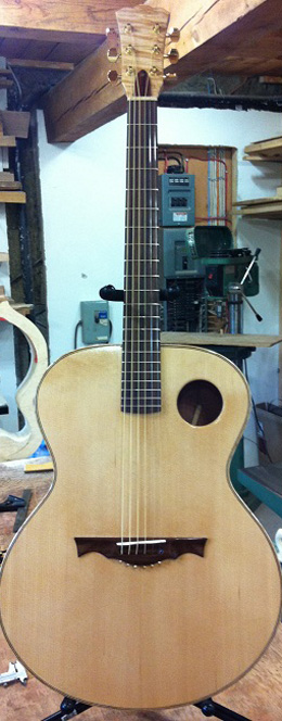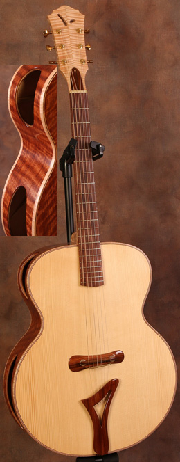 17 pouces, dos en bubinga, table en adirondack, deux ouvertures sur l’éclisse des basses et un barrage inspiré des travaux du Dr. Kasha.