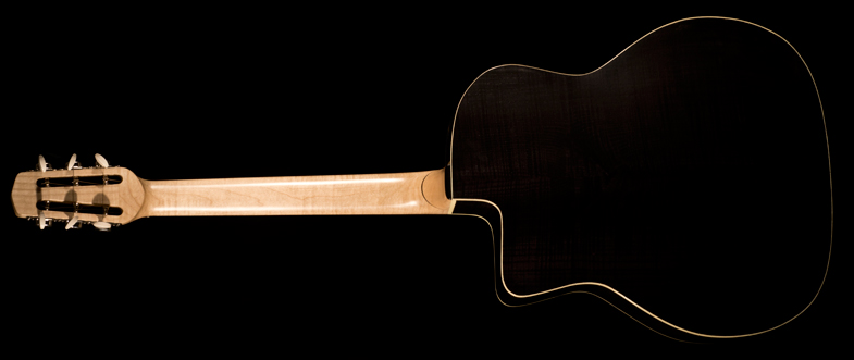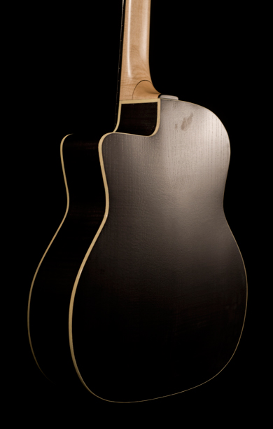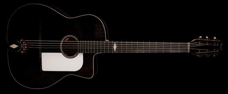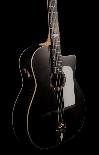 Basé sur un standard Selmer, cette manouche est pourvue d'une bouche sur l'éclisse et est réalisée, pour le dos et les éclisses, dans un frêne ondé et pour la table d'un épicéa.