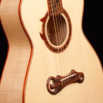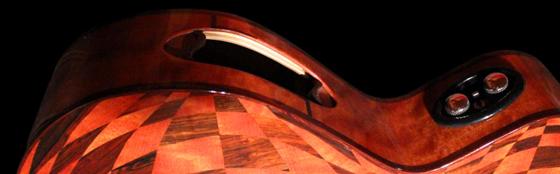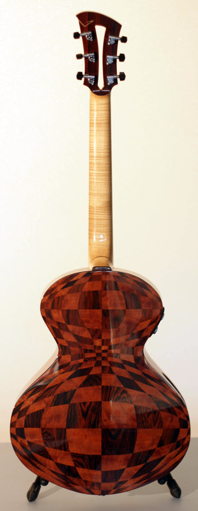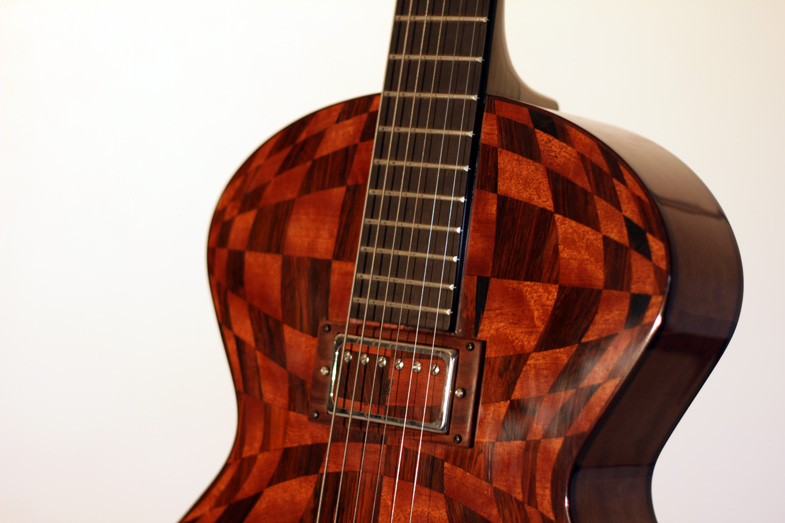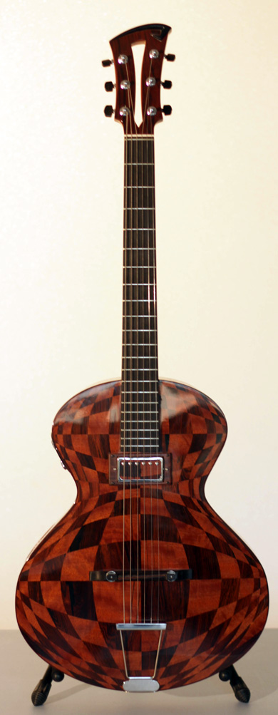 Ce modèle rassemble plusieurs idées de mes fabrications précédentes. La marqueterie en damier de la « Louisa », la trappe latéral comme le modèle « Reflexion » pour éviter les feedback et jongler entre acoustique et électrique comme pour mes « Blues'N'Roll », la forme et la tête caractéristique de la « Precious Slim » et sa mèche.