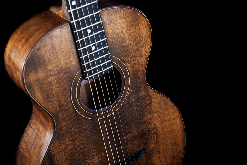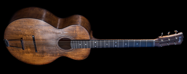 "Petit modèle Parlor type L-1 de Gibson. La guitare emblématique de Robert Johnson. Table en épicéa, fond et éclisse en en poirier flammé, le manche en érable ondé, le tout avec une petite teinte et une finition patiné (huilé, ciré) à l'ancienne. La guitare Delta blues par excellence."
