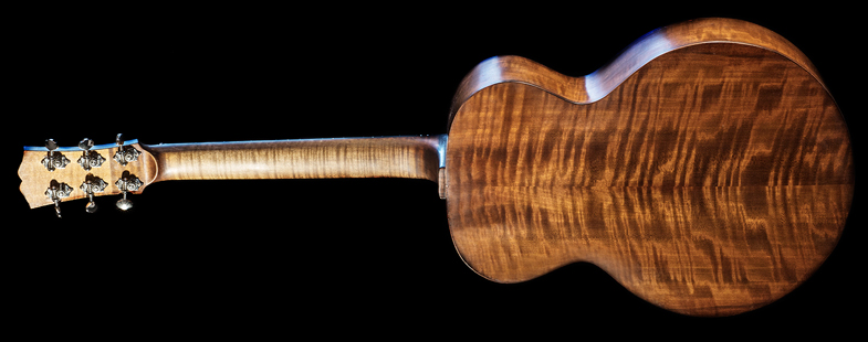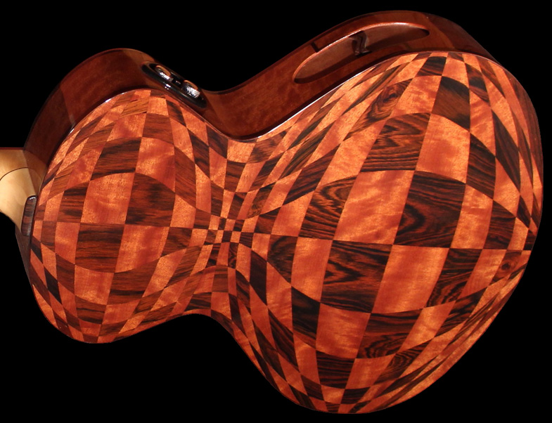 Ce modèle rassemble plusieurs idées de mes fabrications précédente, la marqueterie en damier de la « Louisa », la trappe latéral comme le modèle « Reflexion » pour éviter les feedback et jongler entre acoustique et electrique comme pour mes « Blues'N'Roll », La forme et la tête caractéristique de la « Precious Slim » et sa mèche.