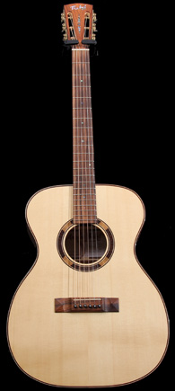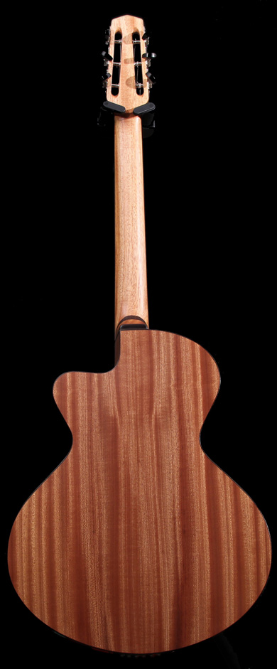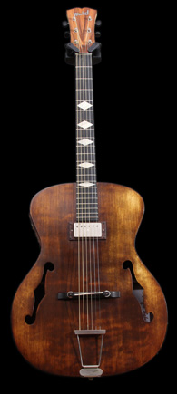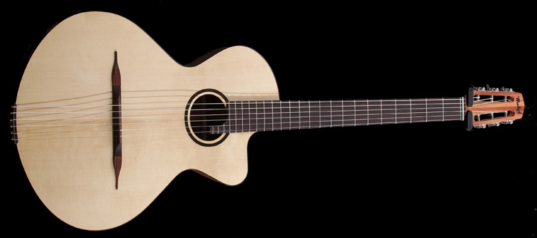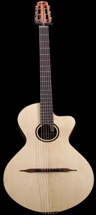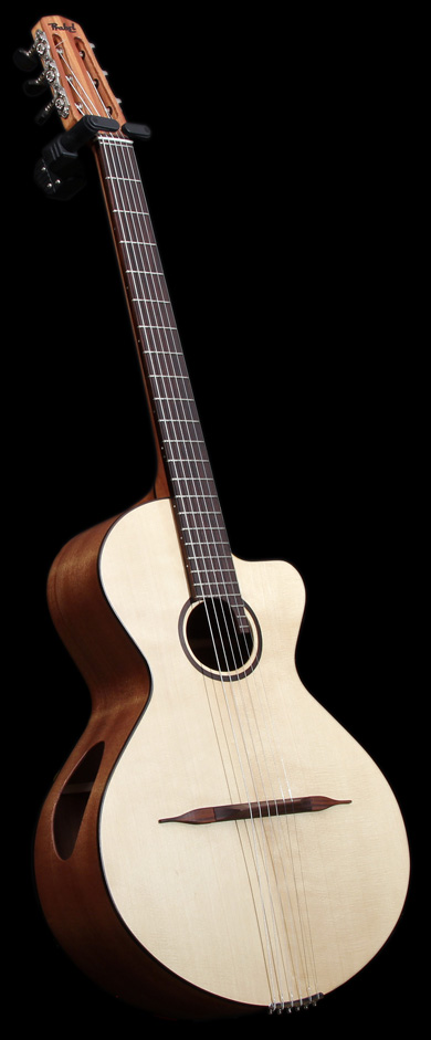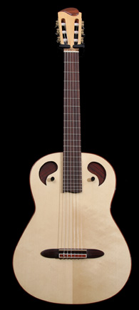 "Premier modèle créé et dessiné par mes soins avec une forme très féminine, à la base prévu pour folk, voir le modèle « Precious Slim ». la taille très resserrée, donne l'impression d'une petite guitare, mais la caisse n'est pas moins large qu'une OM ou une Selmer, et le maintien est ergoniquement très agréable à jouer en position assise.