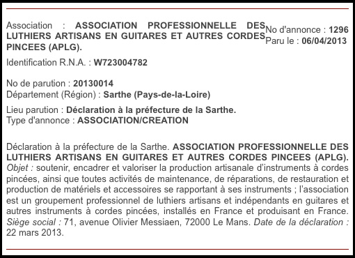 C'est avec beaucoup d'émotions et un grand soulagement que je vous annonce la création de la première association professionnelle des luthiers artisans en guitares et autres cordes pincées: APLG (parution au journal officiel en photo ci-contre).