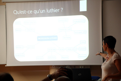 | Présentation du projet PAFI et des dernières avancées de cet outil de mesure qui permet de caractériser des élements de lutherie comme la table nue puis barrée et enfin la guitare terminée. Avec François Gautier ( Enseignant-Chercheur au LAUM) à gauche et Marthe Curtit (Responsable du pôle innovation de l'ITEMM) à droite |