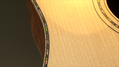Ce modèle studio est un peu particulier puisqu'il est réalisé avec une décoration que l'on retrouve normalement sur les modèles A.V.T. L'abalone utilisée pour le tour de caisse et la rosace est fine et éclatante. |