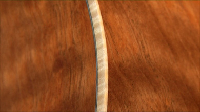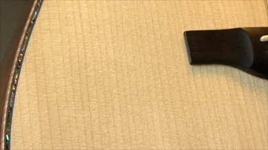 On ne se lasse pas de regarder la belle sous tous les angles. La table d'harmonie en épicéa des Adirondacks avec sa finition naturelle laisse apparaître des veines très larges sur les côtés pour se resserrer progressivement vers le centre.