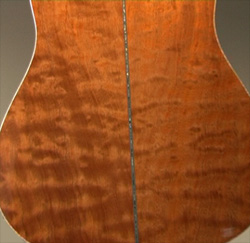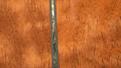 Comme vous pouvez le constater sur les photos ci-contre et ci-dessous, les ondes et cette couleur orangée sont aussi sublimes que ce que l'on peut voir d'un koa ou d'un érable. Et si ce n'était pas suffisant, un filet central en abalone et un filet de tour de caisse en érable ondé subliment le tout.