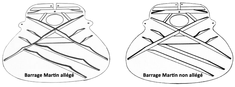 Ci-dessous, deux versions du barrage en X pour guitare folk de chez Martin, repris par partiquement tous les fabricants et luthiers du monde entier. Retrouvez l'article sur l'histoire de la D-28 chez Martin.