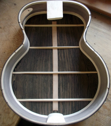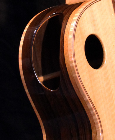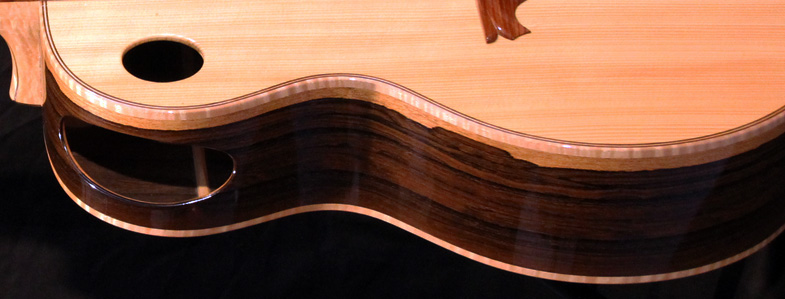 Pour le fond et les éclisses, Benoît applique des contre-éclisses pleines, ce qui permet de rigidifier la couronne d'éclisses, qui elle même est doublée, favoriser la propagation des vibrations et enfin, augmenter la surface vibrante de la table. Le manche en érable ondé est renforcé par 4 tiges de carbone et muni d'une tige ajustable à double action.