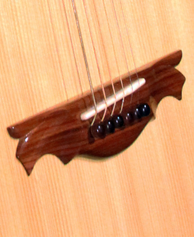 qui est un bois qui pousse dans une région peu étendue située entre le sud du Mexique, le Belize et le Guatemala. Ce bois est très dur, doté d'une forte densité mais assez facile à travailler. Sur ce modèle, Benoît à privilégié l'aspect visuel que procure l'aubier. On le retrouve sur le dos mais également sur les éclisses.