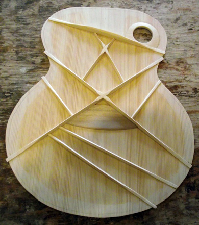 Benoit réalise habituellement deux types de barrages sur ces flat top modernes : l'un est inspiré du célèbre Docteur Kasha et l'autre est un X modifié. Sur le modèle de Michel Gentils, il s'agit d'un X modifié que l'on peut voir ci-dessous avec, bien évidemment, un barrage qui tient compte du déplacement de l'ouïe traditionnelle.