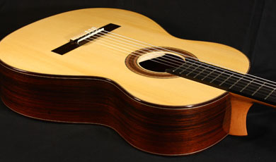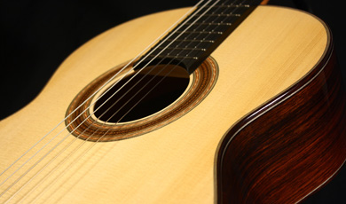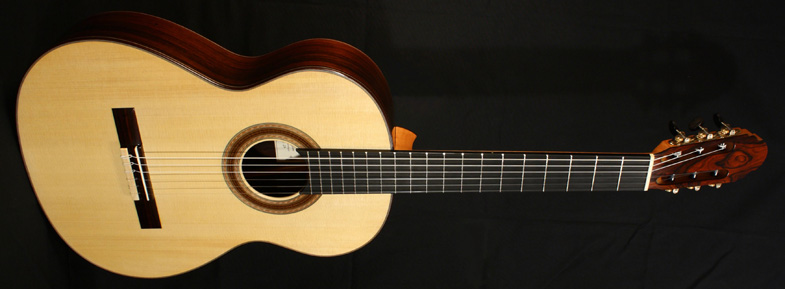"Le modèle en présentation est une guitare classique de concert en épicéa et palissandre que j’ai réalisé pour le guitariste Romain Lange.