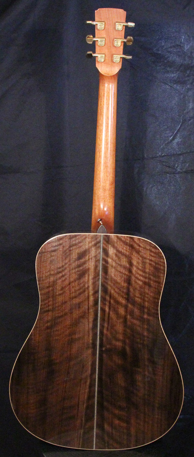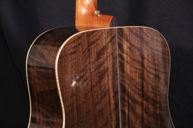 Le noyer, "Juglans regias" de la famille "Juglandaceae est un bois moyennement résistant aux chocs et assez résistant à la compression transversale. Il se travaille assez facilement et est moyennement dense et flexible. Son aspect brun foncé se mélange a des teintes plus claires presque dorées. Sur ce modèle, les pièces qui ont été sélectionnées pour le dos et les éclisses sont magnifiques avec un aspect ondé qui n'a rien a envier à d'autres essences plus exotiques.