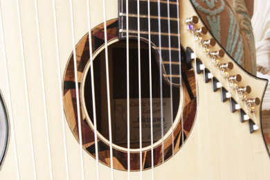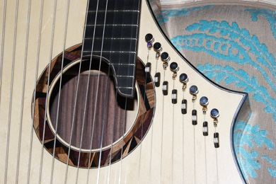 Pour ce qui est de l'hestétique, je souhaitais un instrument aux lignes parfaitement fluides avec une grande élégance. Nous étions sur la même longueur d'onde avec Cédric. Il m'a proposé la ligne générale de l'instrument qui me convenait tout à fait et nous avons travaillé ensemble sur le design de la tête qui est absolument original. Pour la rosace, nous avons eu l'idée d'une mosaïque de bois à laquelle Cédric a donné forme et qu'il a étendue à la tête des basses. Le choix des filets s'est tourné vers l'ébène qui donne beaucoup de classe grâce à sa sobriété. Cédric m'a proposé un petit pan coupé sur la table qui est très original et confortable. Cette guitare est incroyablement légère grâce à certaines prouesses techniques de Cédric. Elle est très confortable tant à tenir que sur le manche.