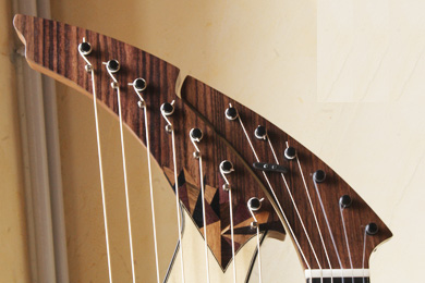 J'ai réfléchi à ce point et j'ai eu une logique différente. Je voulais que les cordes aigües supplémentaires sonnent différemment des cordes du manche afin d'accroitre l'impression d'entendre plusieurs instruments. J'ai donc décidé d'avoir des cordes nylon sur le manche et des cordes acier pour les aigües. Je peux ainsi créer des systèmes de réponses entre tous les registres. Les cordes basses, elles, sont en nylon filé. Cette guitare harpe à 21 cordes couvre 5 octaves complètes en partant d'un mi grave.