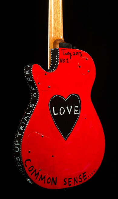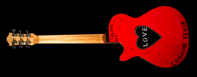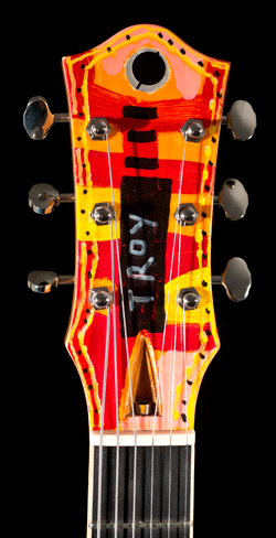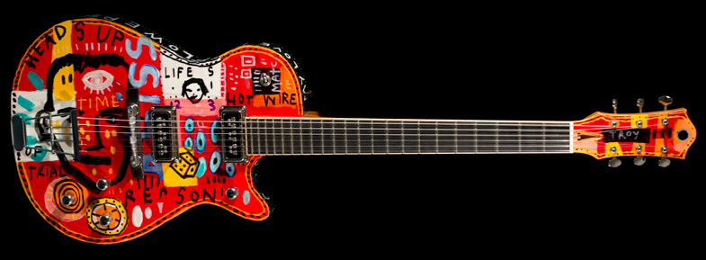 En photo, nous avons ici une guitare très étonnante dans sa finition puisqu'elle a été entièrement peinte par l'artiste américain "Troy Henriksen".