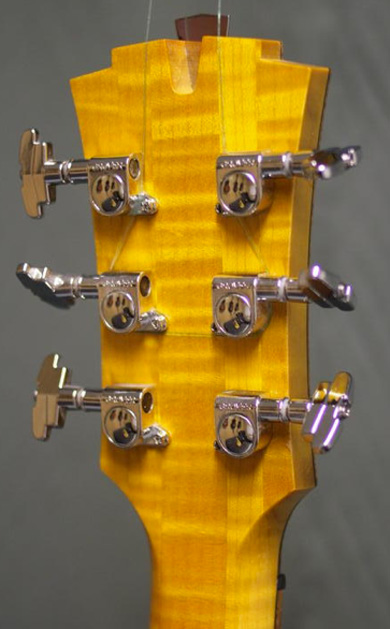 En effet, l'aspect général parait sobre et discret mais un regard plus précis permet alors de découvrir le travail minutieux de Christophe. Les filest en Koa habille cette guitare d'une façon des plus élégantes. La tête, les mécaniques, le cordier et le pickguard sont typés art déco.