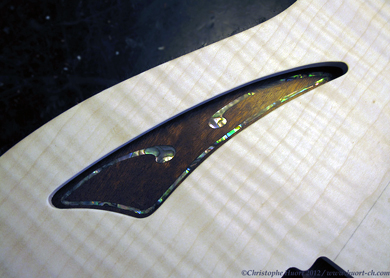 • Corps évidé, dos acajou, table voûtée en sycomore ondé