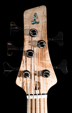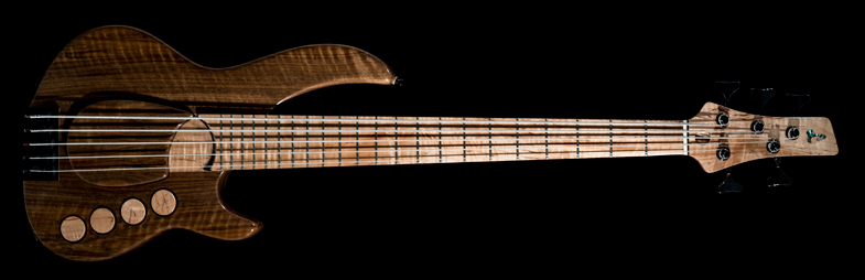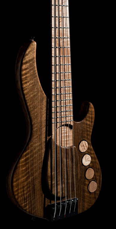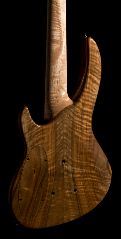 La pièce d'érable destinée à ce manche conducteur était décidément trop belle ! Je n'affectionne pas particulièrement la sonorité des touches en érable mais il aurait été dommage de cacher ces ondes anarchiques et profondes. Un long débat intérieur me conduisit à une touche en palissandre de Rio du 19° siècle recouverte d'une sur-touche découpée dans le même bloc d'érable. Le corps est réalisé en noyer royal ondé (c.à.d.: planté avant la révolution française), appairé à l'avant comme à l'arrière. Des filets du même palissandre que la sous-touche agrémentent diverses régions de la basse.