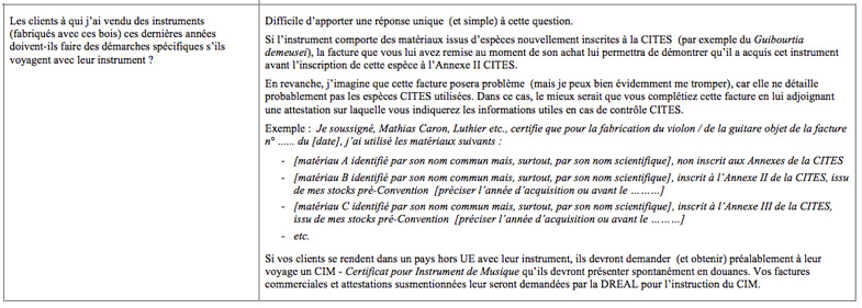 S'agissant des musiciens qui voyagent dans le monde entier avec leur(s) instrument(s) personnel(s), il existe un document spécifique destiné à faciliter les passages multiples en frontières, le CIM. Ci-dessous, la réponse de la CITES à la question du luthier Mathias Caron (Voir le document dans son intégralité).