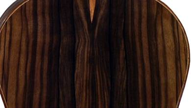 Le dos et les éclisses sont réalisés en ébène de Macassar. Quand on connaît la difficulté de travailler cette essence, on n'ose imaginer ce que le pliage des éclisses a dû représenter comme effort et d'attention. Le résultat est ici sublime et digne du plus figuré des palissandres de Rio.