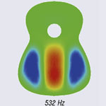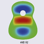 "Les mouvements de la table d'harmonie d'une guitare sont décomposés sur ses modes élémentaires de vibrations. Il en existe une infinité. Ci-dessus les cinq premiers modes calculés par notre modèle. La couleur verte indique le niveau de la surface médiane, le rouge une surélévation (bosse) et le bleu un abaissement (creux). "