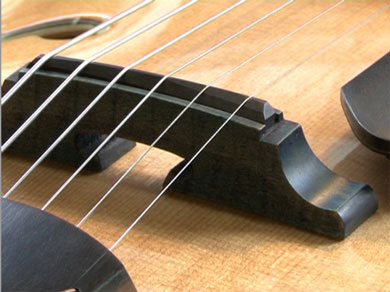 Les matériaux choisis sont le sycomore européen pour le fond et les éclisses, un érable argenté du nord québécois pour le manche. Une épinette de sitka est utilisé pour la table d'harmonie tandis que deux types d'ébène couronnent le tout (Tête, touche et cordier)!